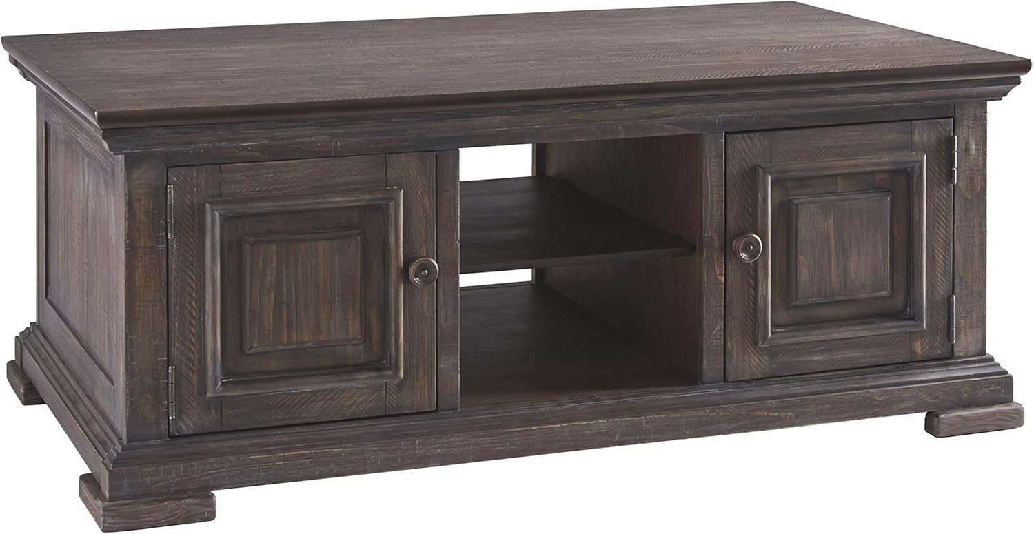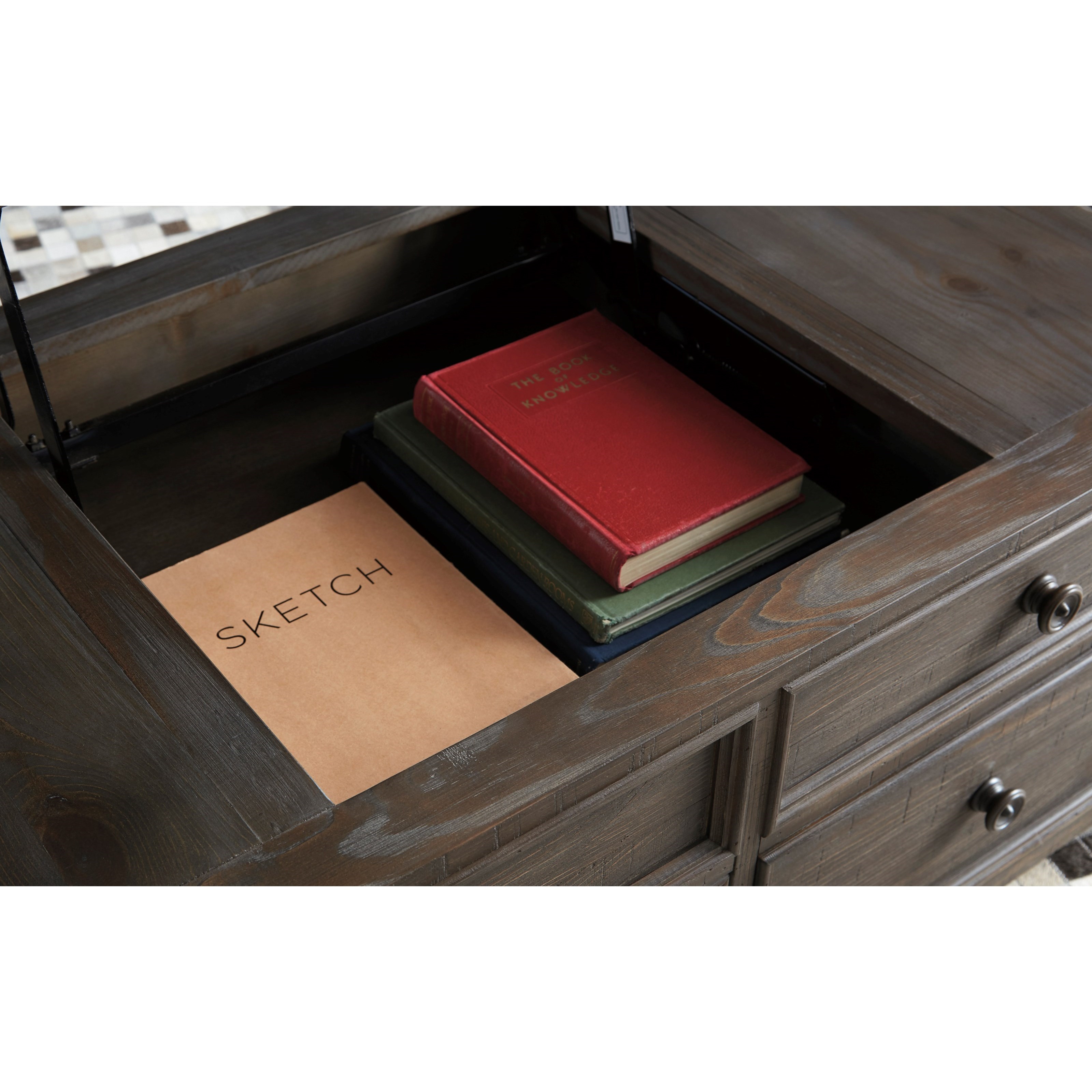 Signature Design by Ashley Living Room Wyndahl Coffee Table With Storage T813-1 at Turner Furniture Company Inspired by heavy and hearty lodge-style furnishings from days gone by this coffee table brings the past brilliantly into the present. The coffee tables spring lift topperfect for impromptu. Distinctive details include robust mouldings raised panel door fronts for rich dimension and a distressed aged pine color finish with light wire-brushed texture thats pure artistryP.