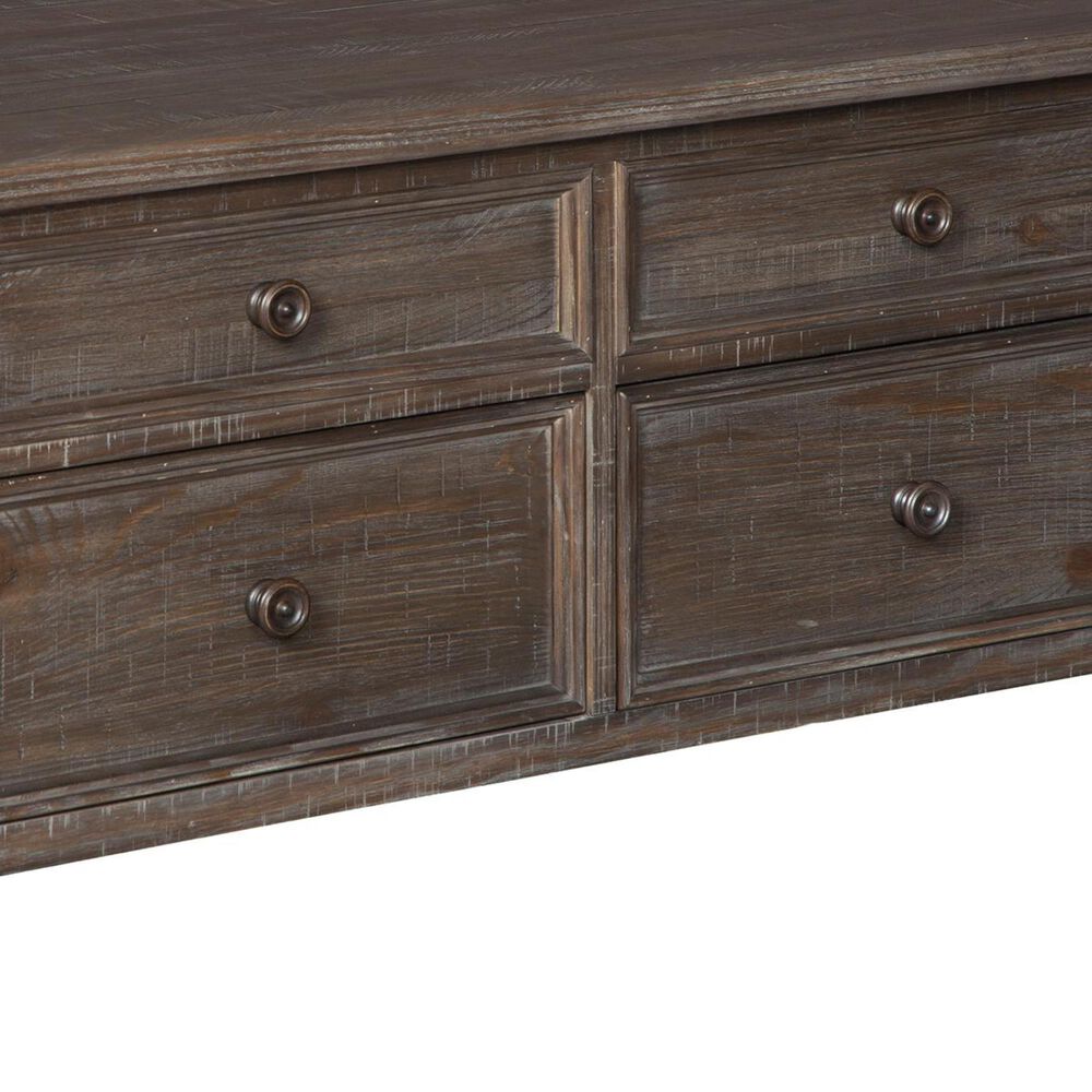 Durable and full of storage options this piece features four storage drawers along with a gorgeous aged pine color finish that has been distressed to add a rustic feel. Inspired by heavy and hearty lodge-style furnishings from days gone by this end table brings the past brilliantly into the present. Distinctive details include robust mouldings raised drawer fronts for rich dimension and a distressed aged pine color finish with.